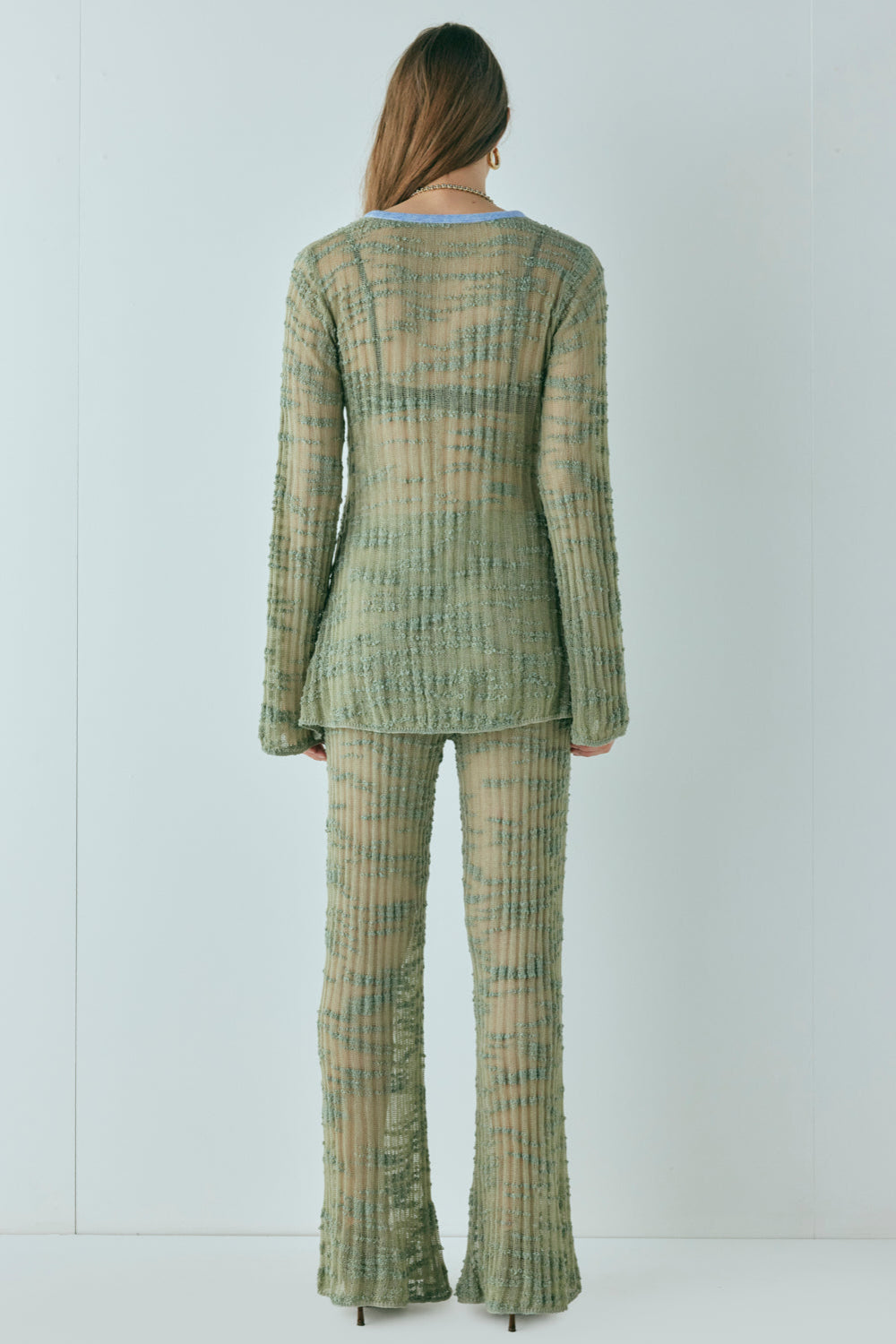The Aliya Knit Flare Pants Khaki are knitted in a ribbed textured yarn, and feature an elastic waistband. Designed in Australia.