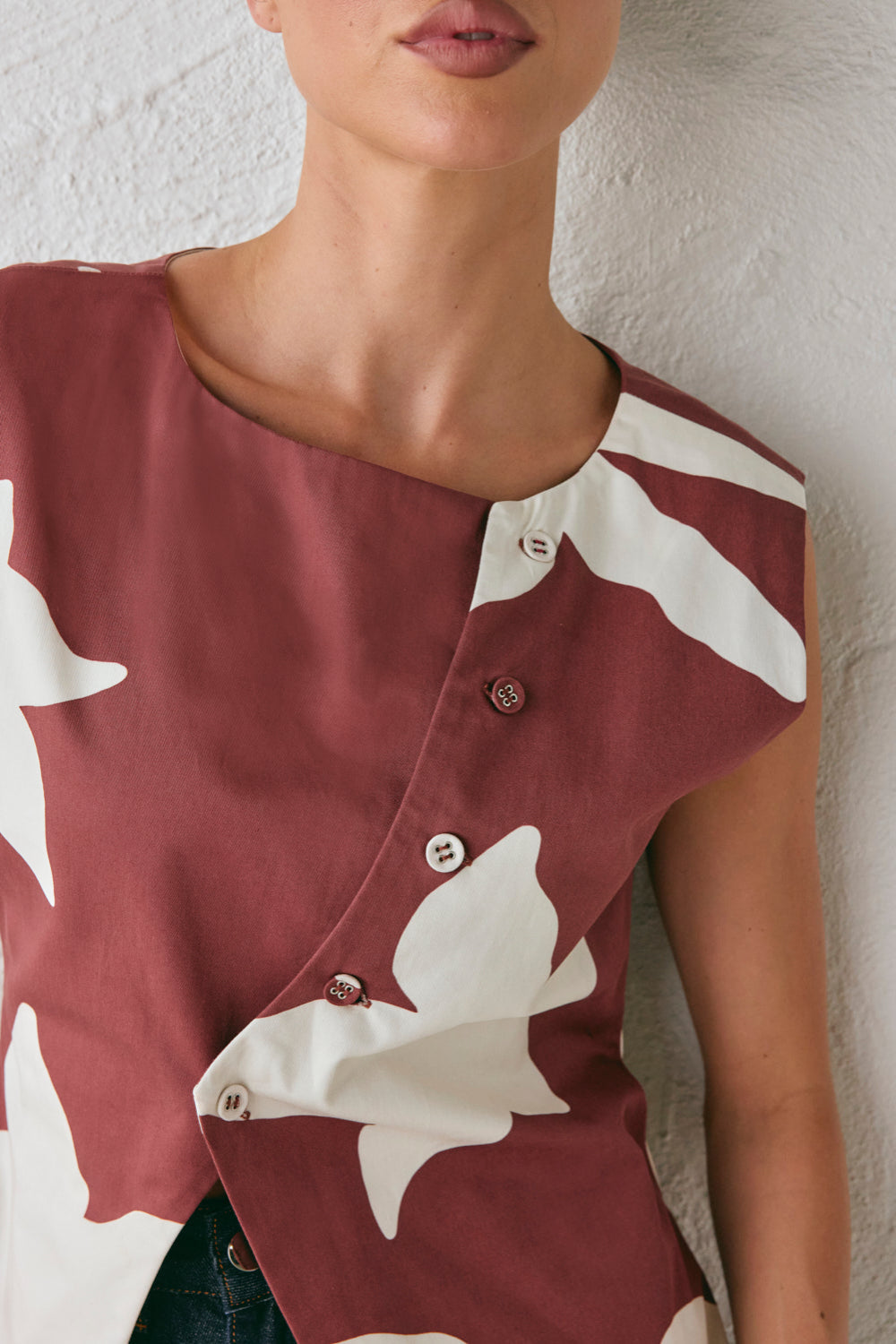 The Aria Vest Ira is made from 100% Cotton. Featuring an exclusive in-house print, asymmetrical front buttons with side and back splits. Designed in Australia.