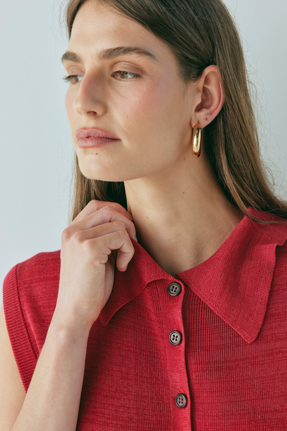 Aubrey Knit Top Red is made from a stretch knit fabric, featuring a centre front button closure with a ribbed collar, armhole and hem. Designed in Australia.