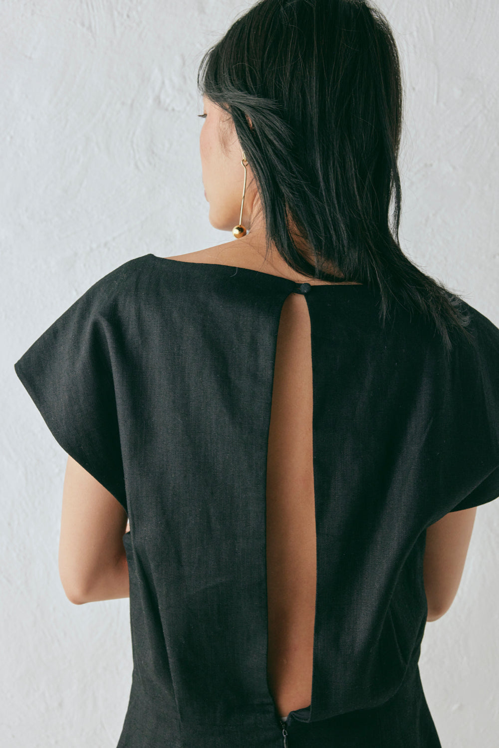 The Cameron Mini Dress in Black features a low V back, centre back button, and lower back zip. Fully lined for comfort. Designed in Australia.