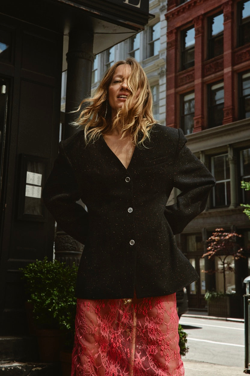 The Dalton Blazer in Black features centre front buttons, shaped through body & front welt pocket. Designed in Australia.