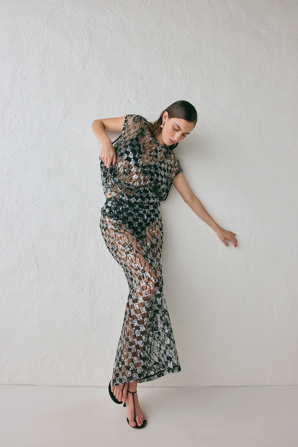 The most-loved Devyn Sequin Midi Skirt, now in Black. Designed in a sequin sheer fabric with a side zip closure and back slit feature. Designed in Australia.