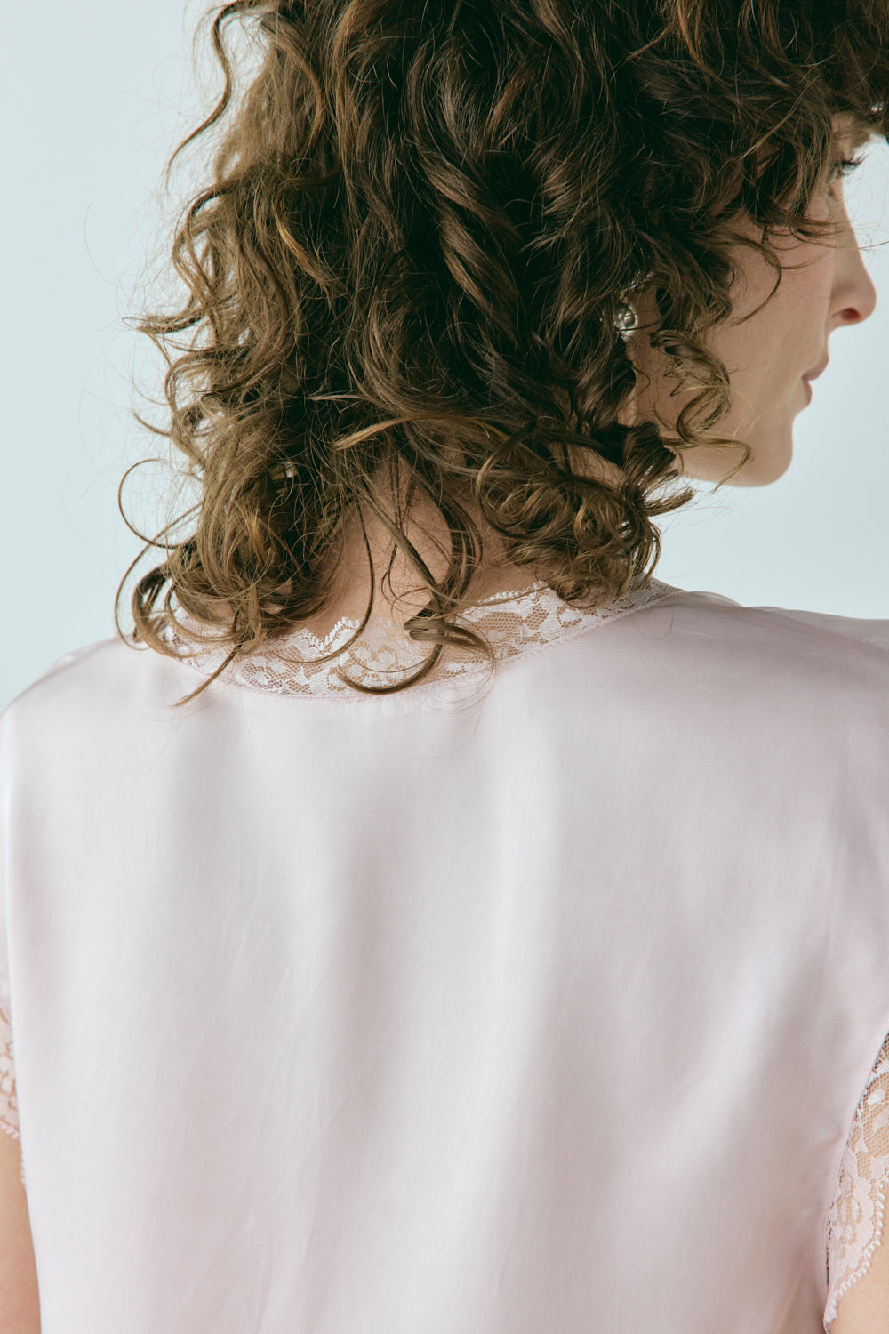 The Flores Satin Top in Musk. Features lace trim detailing, gathered under bust and V-neck design. Designed in Australia.