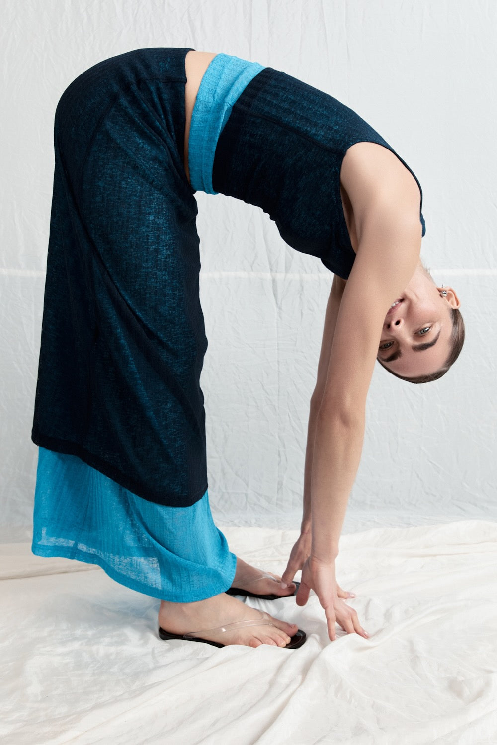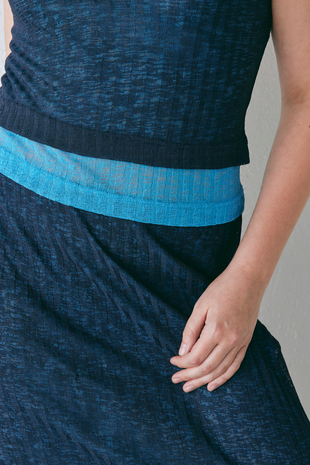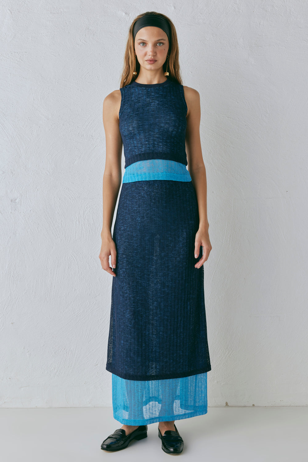 The Jil Maxi Skirt in Navy. Designed in a stretch knit fabric, with a contrast double layer and elastic waist. Designed in Australia.