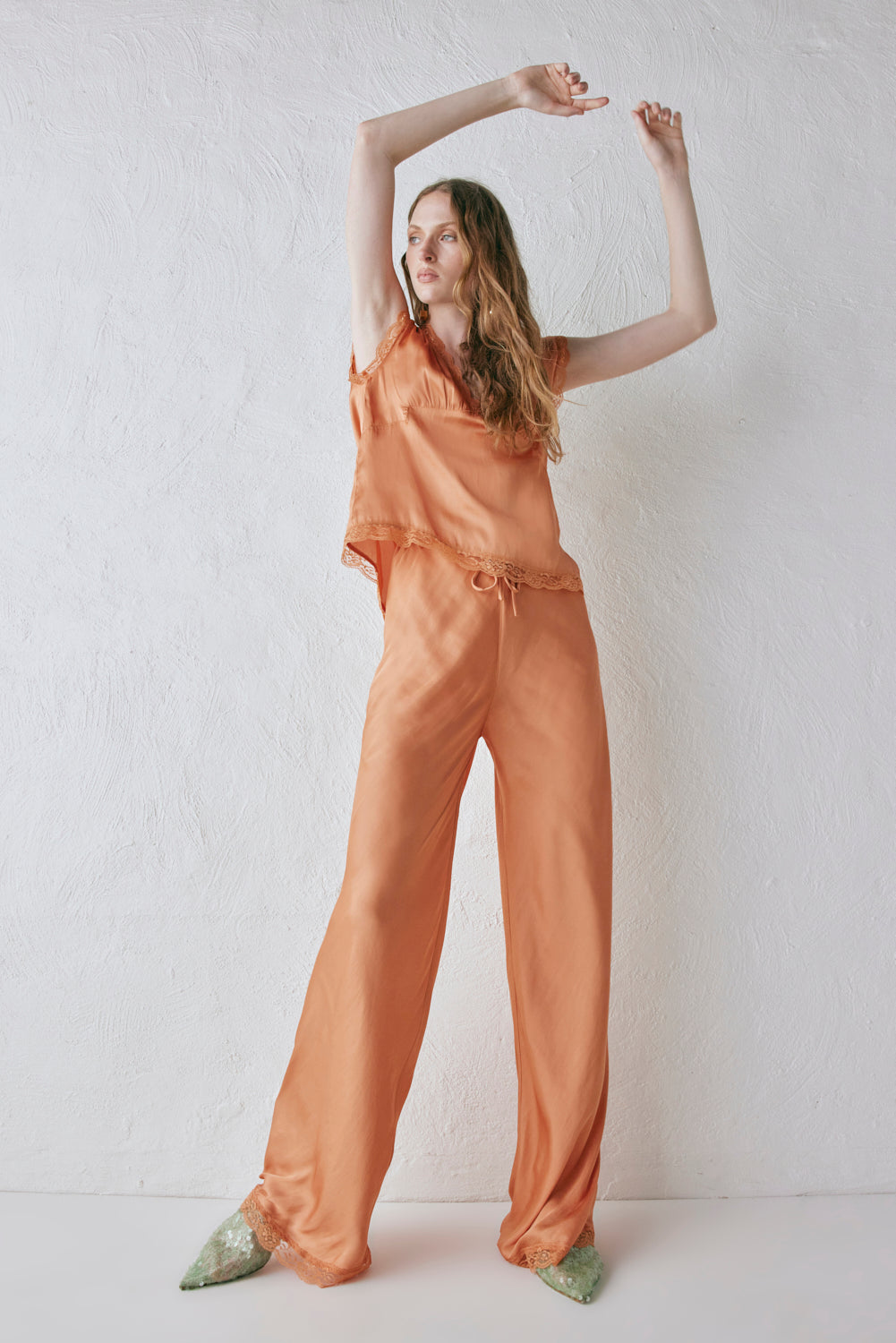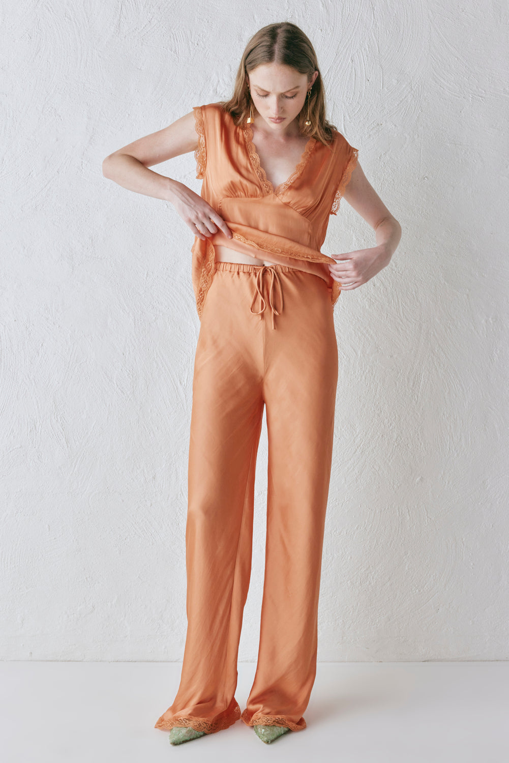 The Josefin Satin Pants in Peach are designed with a bias-cut silhouette, elastic drawstring waist and delicate lace detail at the hem. Designed in Australia.