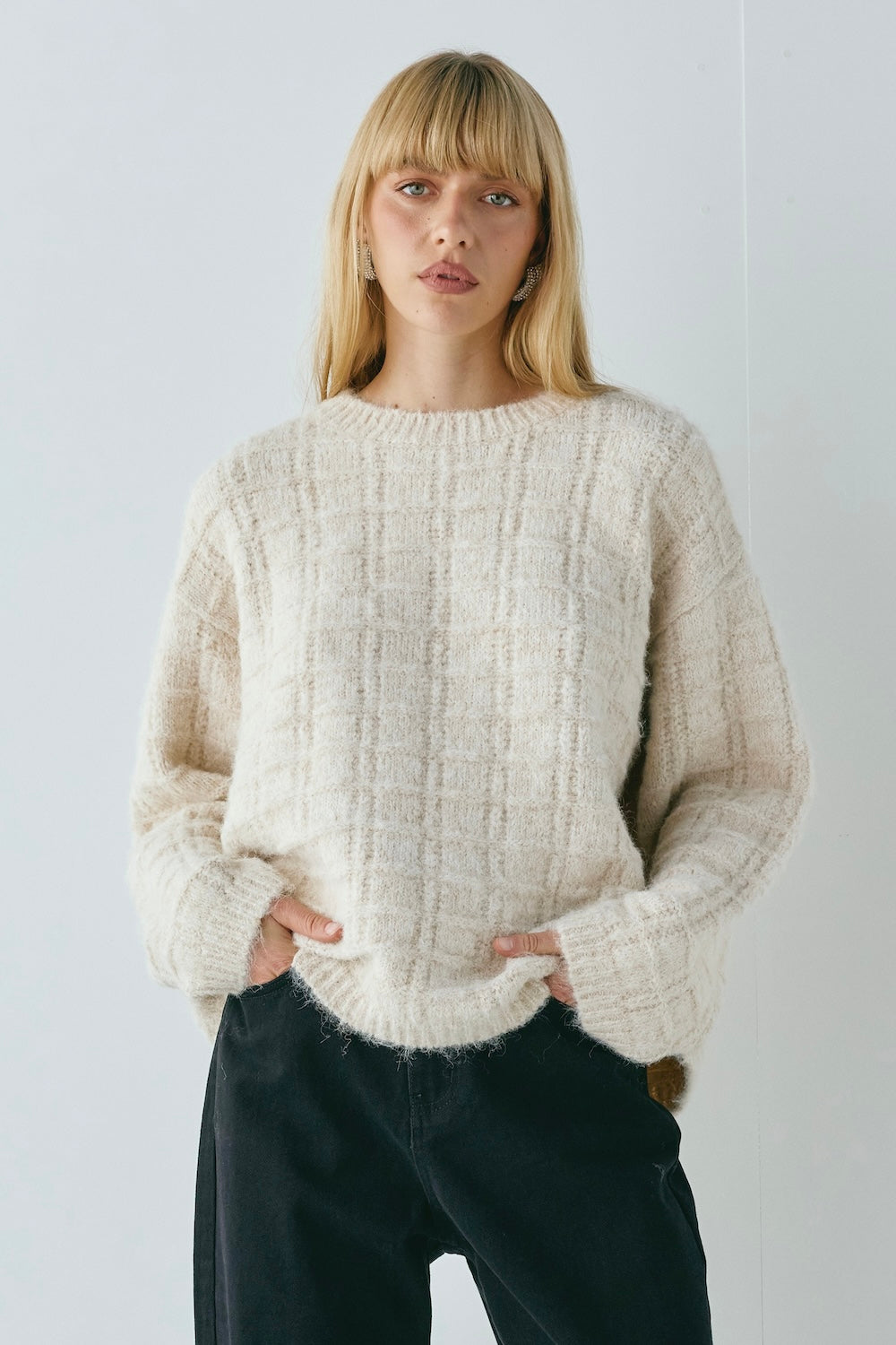 The Juni Knit Jumper in Oat is made from a soft wool blend. Featuring a stretch knit fabric with ribbed detailing at the neckline, cuffs, and hem. Designed in Australia.