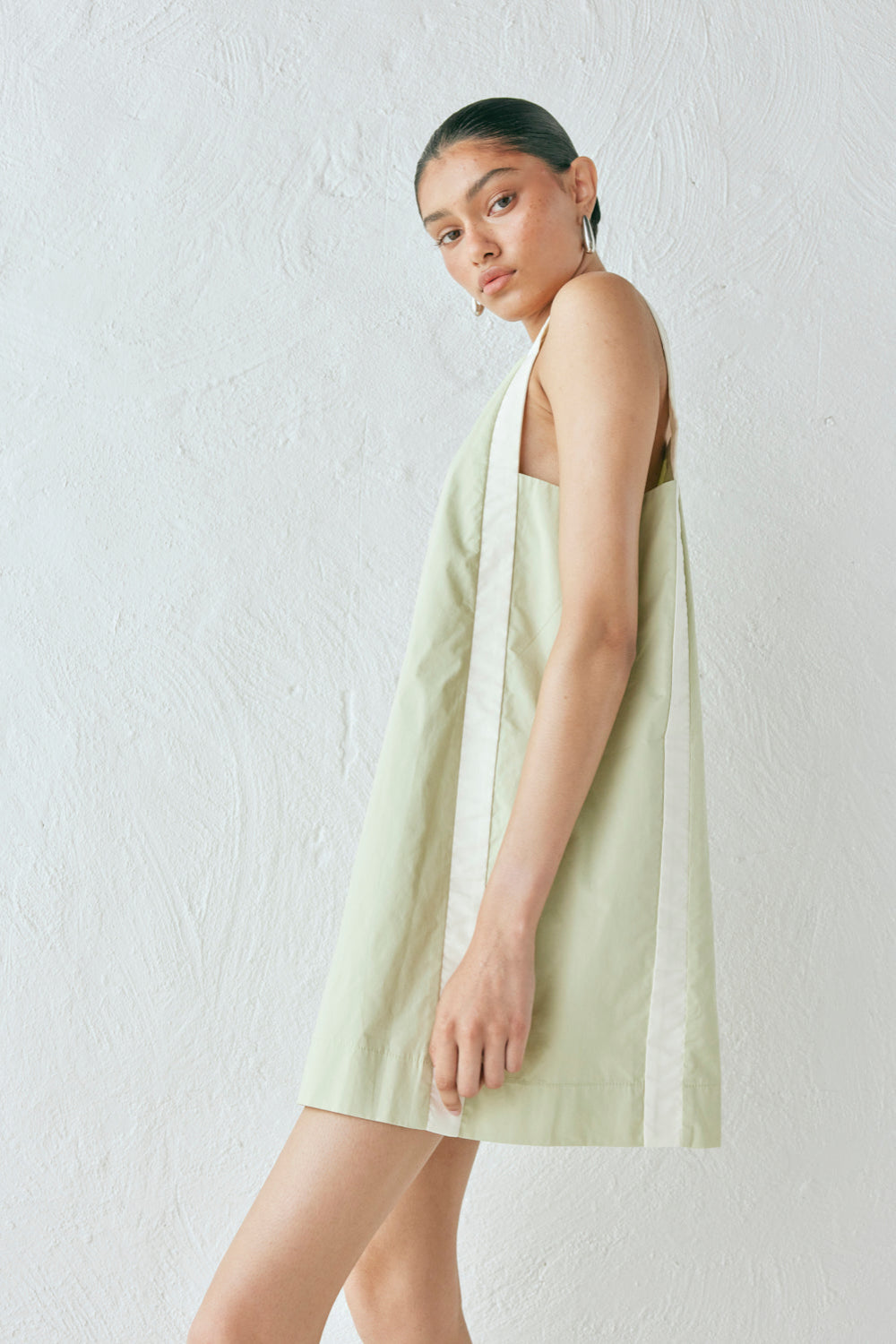 The Luma Mini Dress in Sage. Made from 100% cotton and is fully lined with a side panel contrast detail. Designed in Australia.