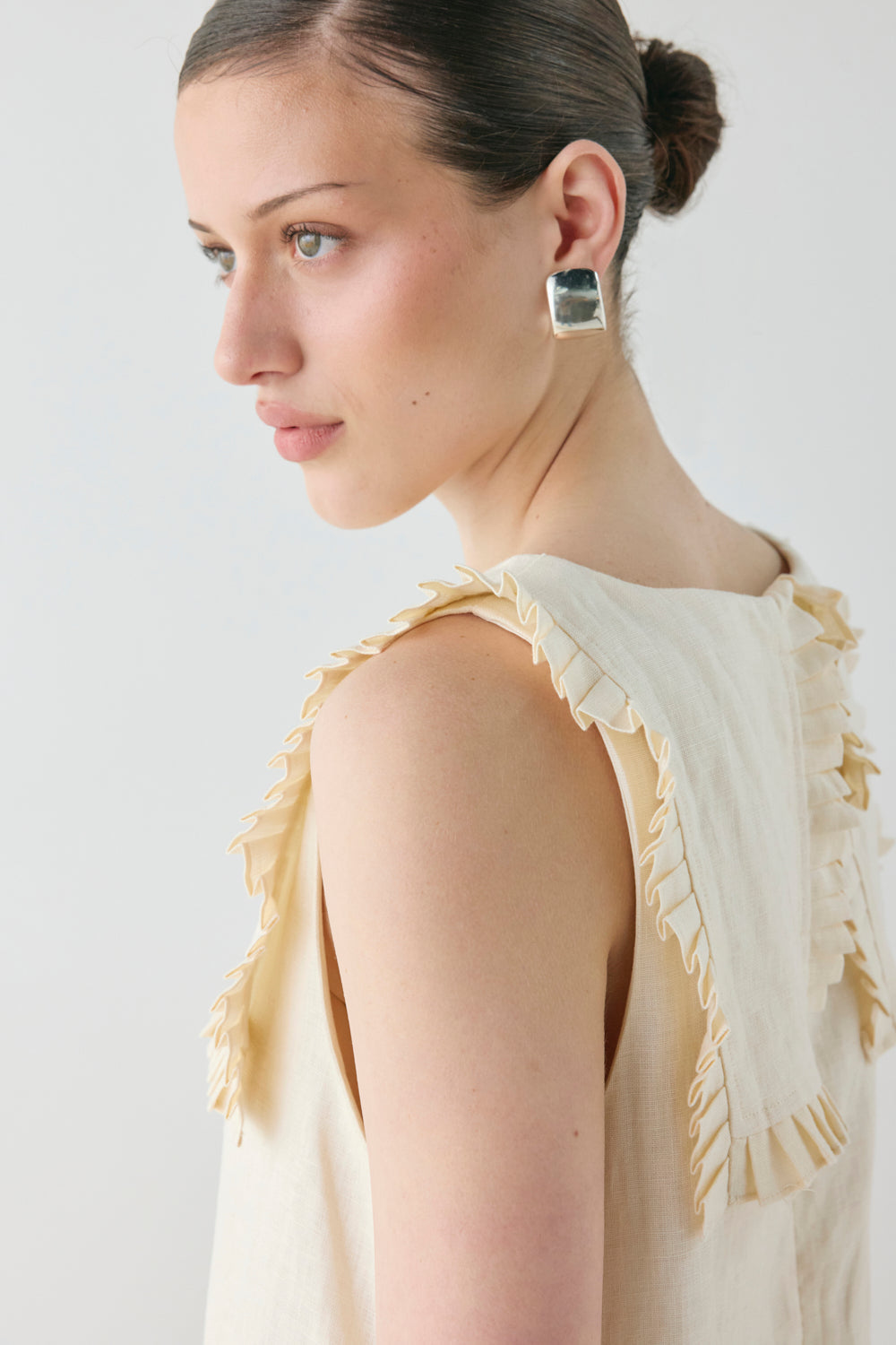 Bib design, frill trim and a cream linen finish - the midi dress that keeps things polished yet effortless. Fully lined with a back zip. Discover now.