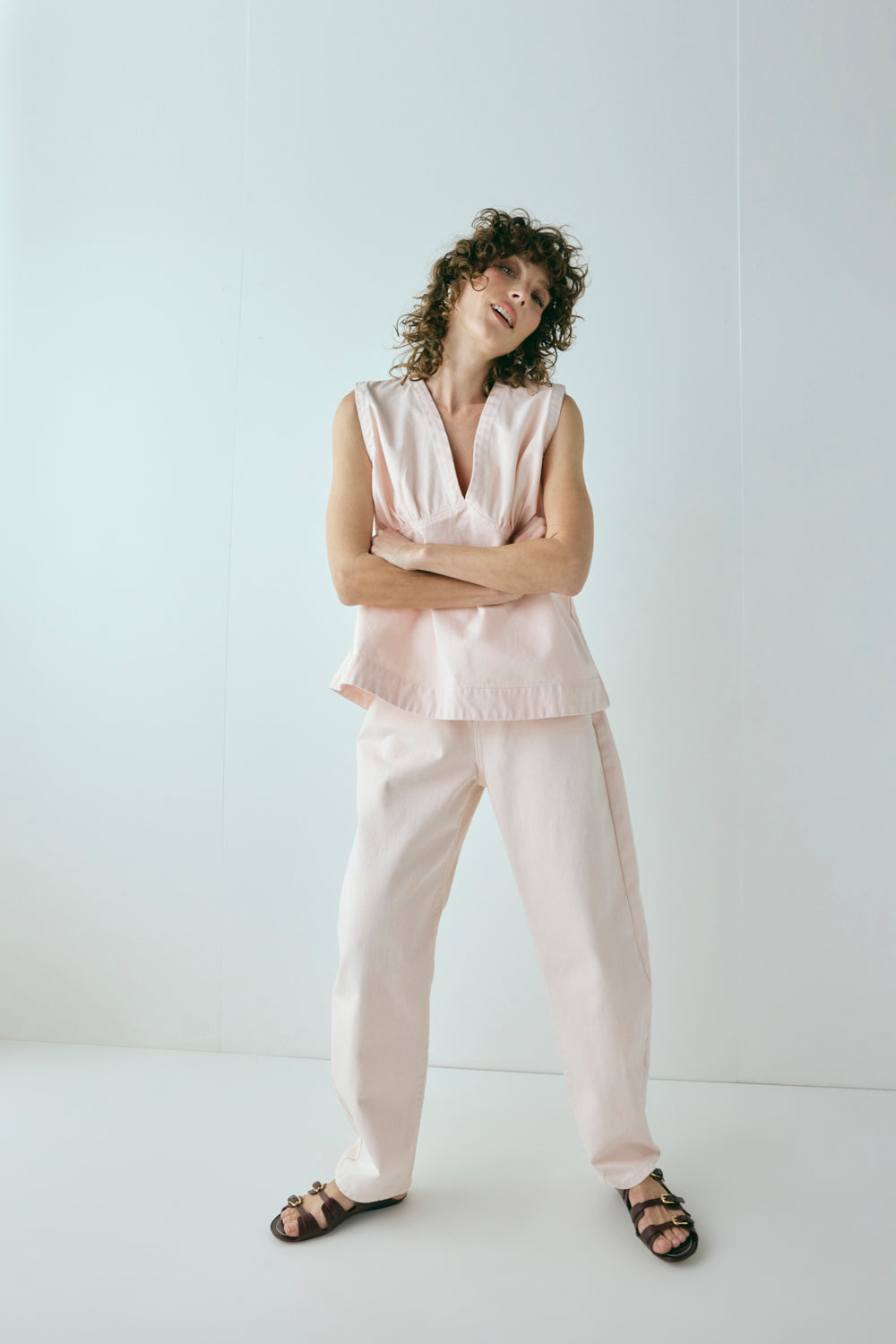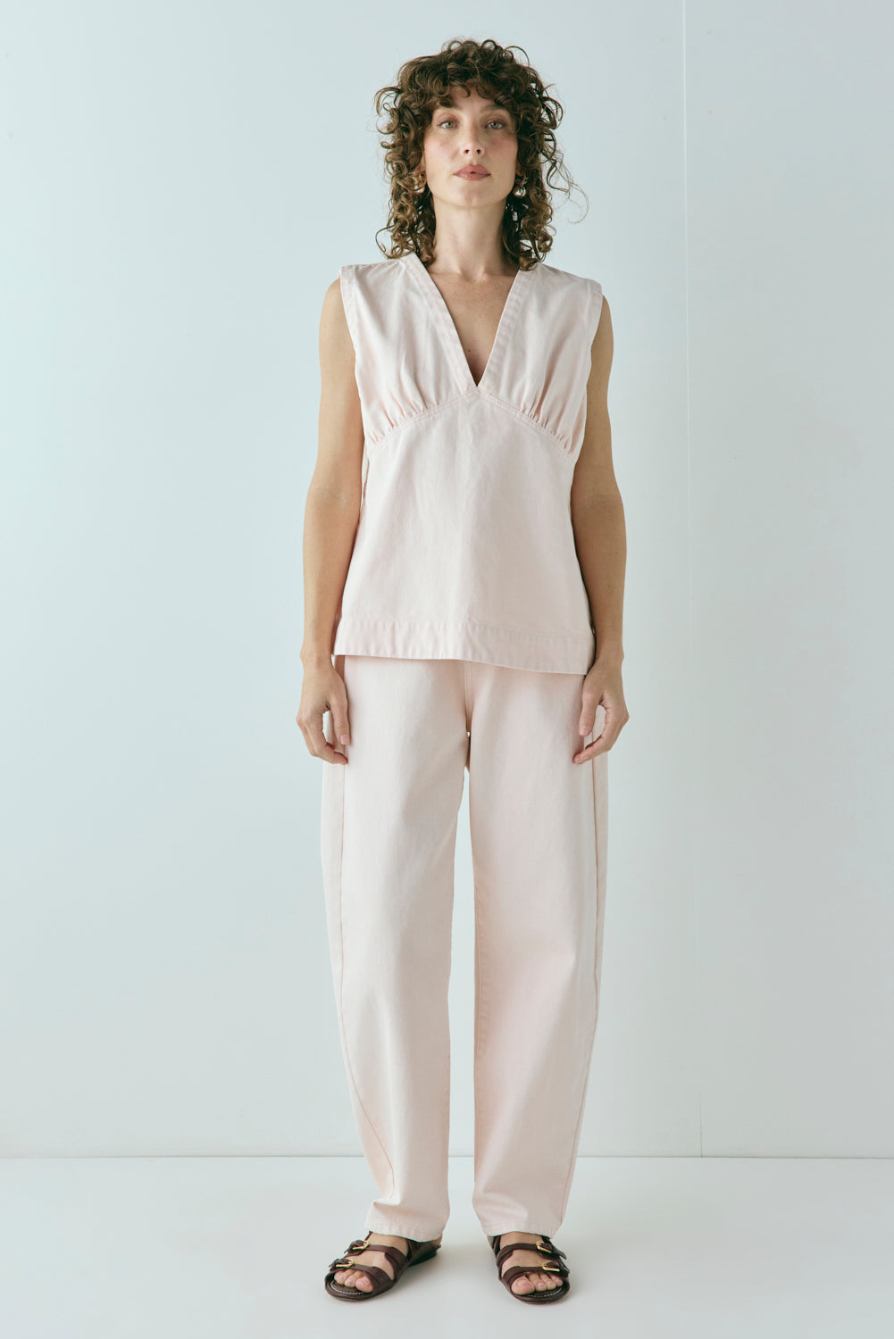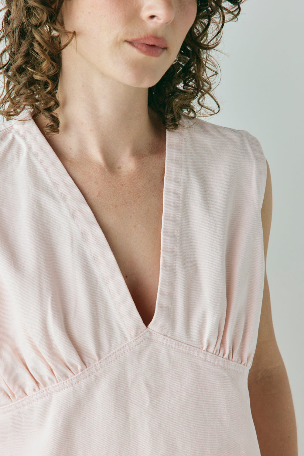 The Nola Denim Top in Musk, made with 100% cotton. Designed with a V neck front  and gathered under bust. Designed in Australia.