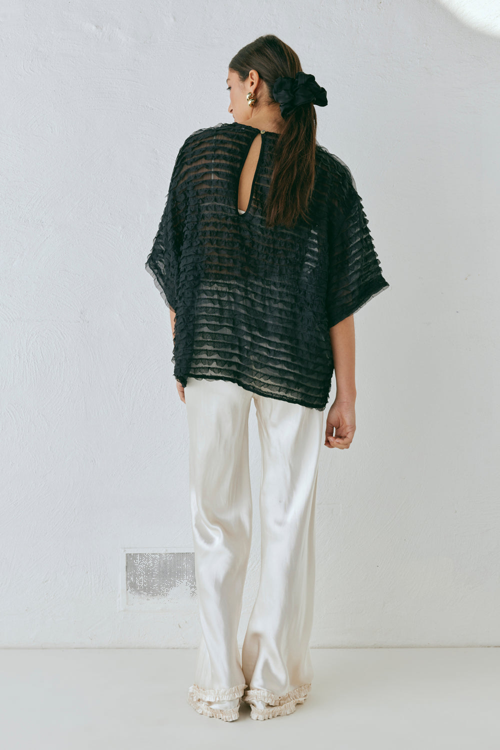 Reya Top Black is designed with a slightly sheer, frill detail & back keyhole cut-out with button. Designed in Australia.