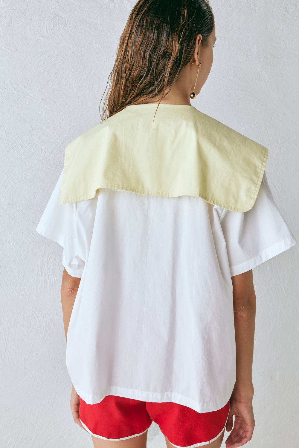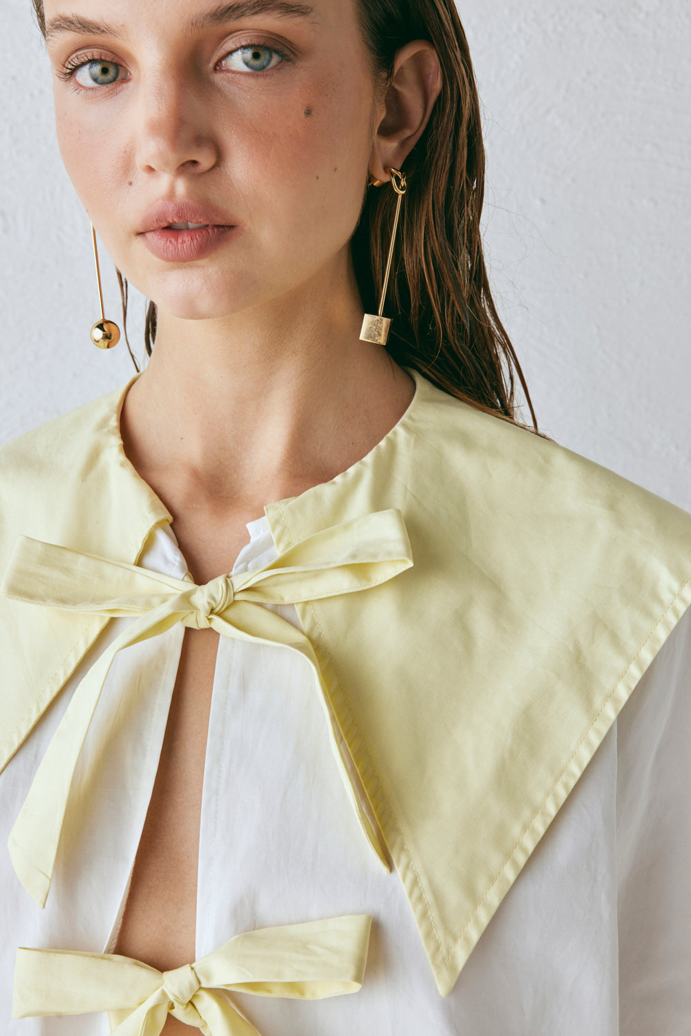 The Romy Smock Top in Lemon. Made from 100% cotton, featuring a large collar, front ties and boxy fit. Designed in Australia.