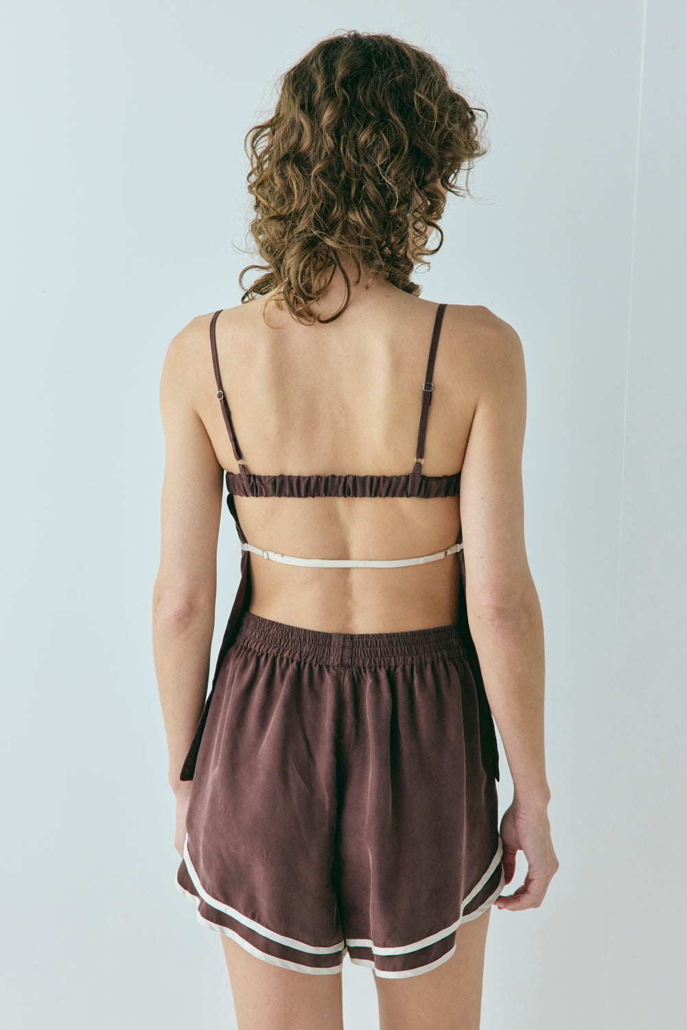 The Ryett Top in Wine. Featuring a straight neckline, open back with elastic back strap, adjustable shoulder straps and shell button detailing. Designed in Australia.