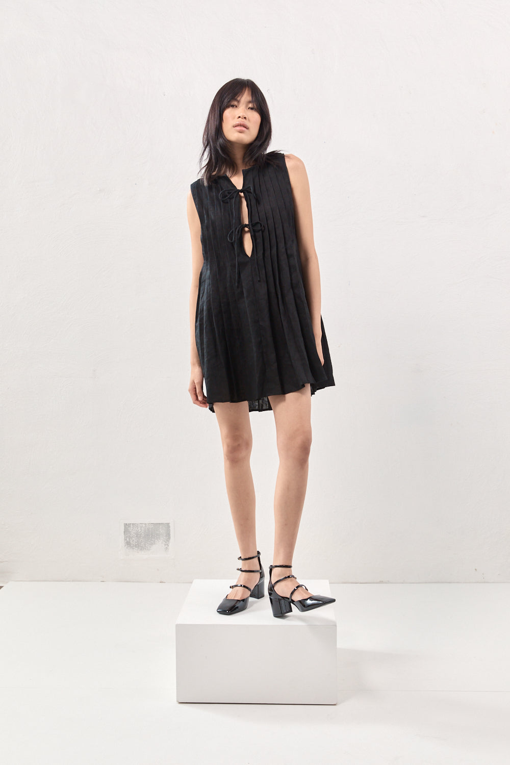 The Valeria Linen Mini Dress in Black. Made with 100% linen with pleated design, front ties and a relaxed fit. Designed in Australia.