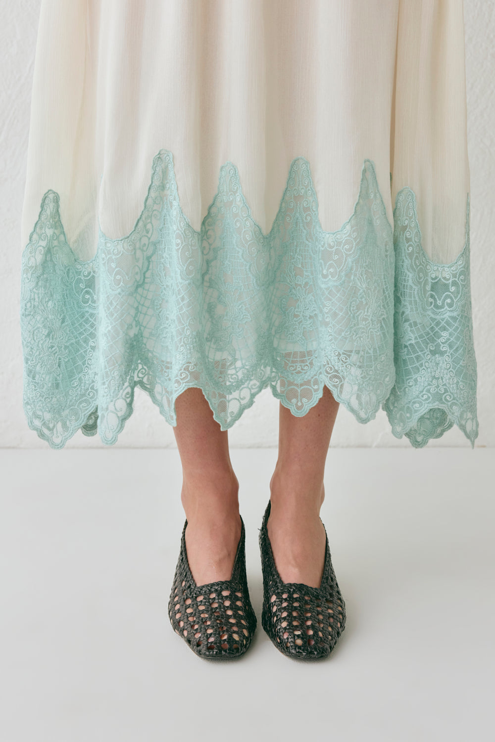 The Valery Midi Dress in Cream features an elastic drawstring waist, contrast lace detailing. Designed in Australia.