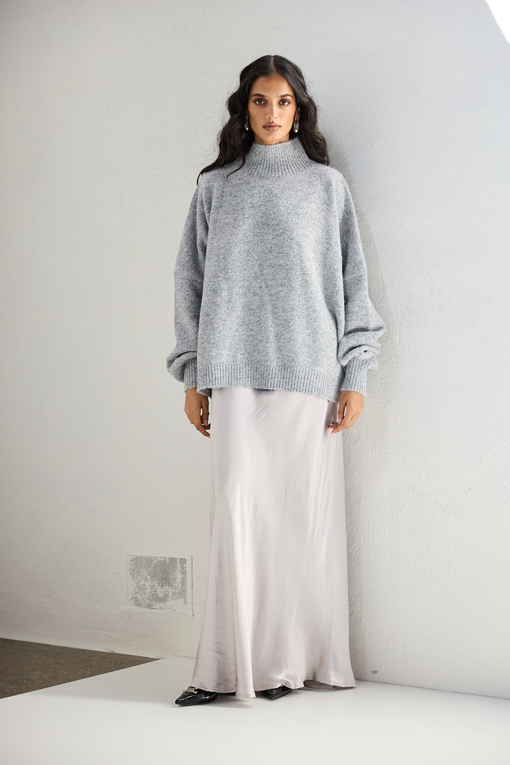 The Yumi Knit Jumper in Grey Marle. A stretch knit with high neck, ribbed neckline, cuffs and hem and oversized fit. Designed in Australia.